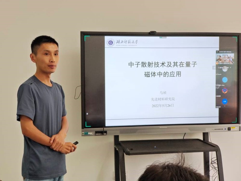 接着,我院马祯和熊东彬两位博士以学术报告的形式与参加活动的师生开展学术交流。马祯博士以《中子散射技术及其在量子磁体中的应用》为报告题目,详细介绍了中子散射技术的发展历程与国内外大型中子源建设和相关中子谱仪,并以量子自旋液体为例,简要介绍其在当前凝聚态物理学得前沿方向—量子磁体研究中的应用。熊东彬博士以《二维纳米材料的结构调控与电化学储能》为报告题目,介绍了在“双碳”战略背景下,发展电化学储能技术对缓解能源危机和环境污染的重要性,并以二维MXene材料和MoSe2材料在锂硫电池中的应用研究为例,阐明通过材料结构调控促进电化学储能性能的提升的作用机制。报告结束后,两位博士与在场师生就相关问题进行了深入的讨论。最后,刘俊明教授也对两位博士的报告给出点评,并提出了诸多宝贵的意见。