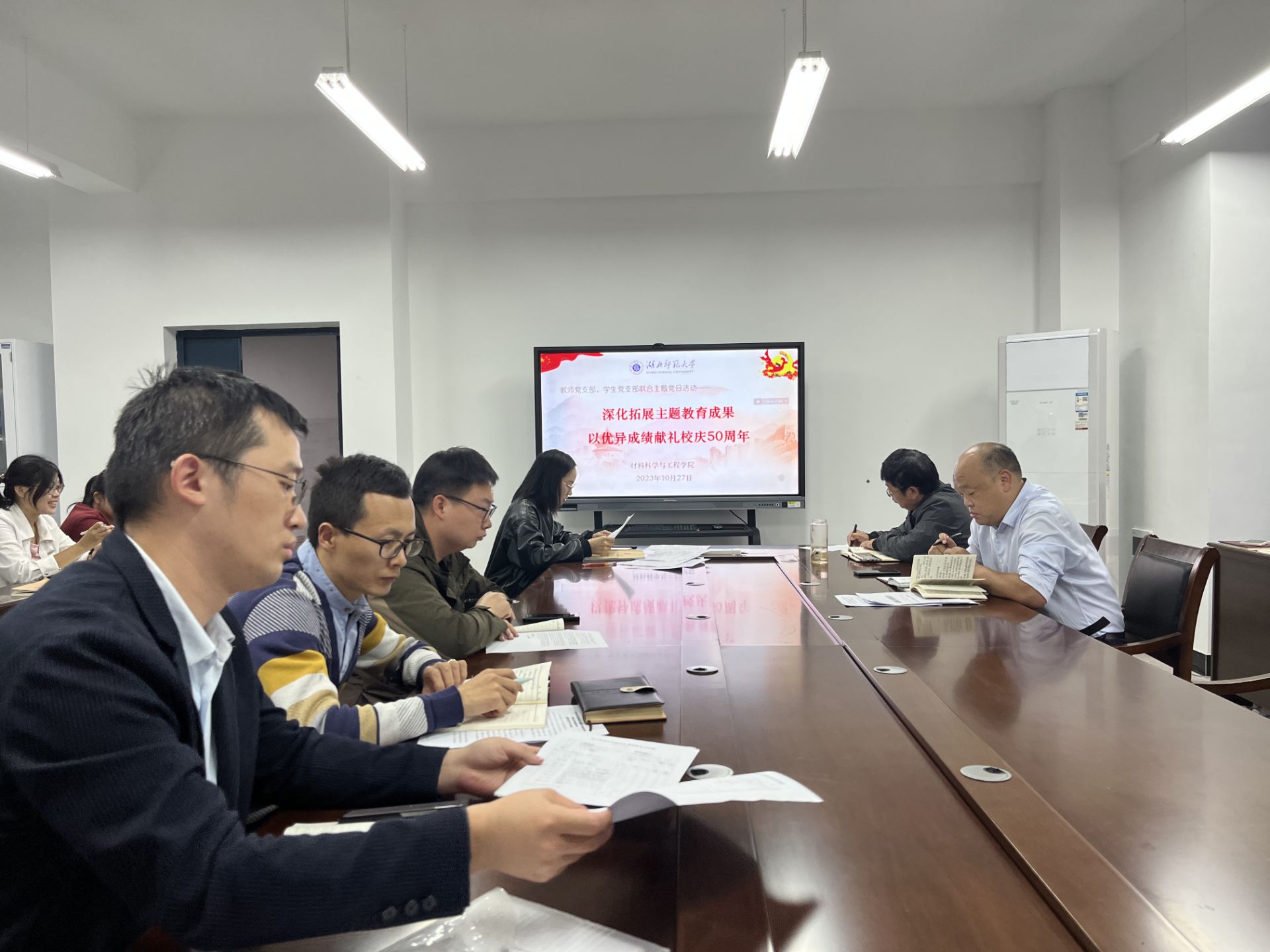 2023年10月27日下午2:20,bv1946伟德国际教师党支部和学生党支部召开全体党员大会,组织开展题为“深化拓展主题教育成果 以优异成绩献礼校庆50周年”联合主题党日活动。活动由教师党支部书记潘其云同志主持。