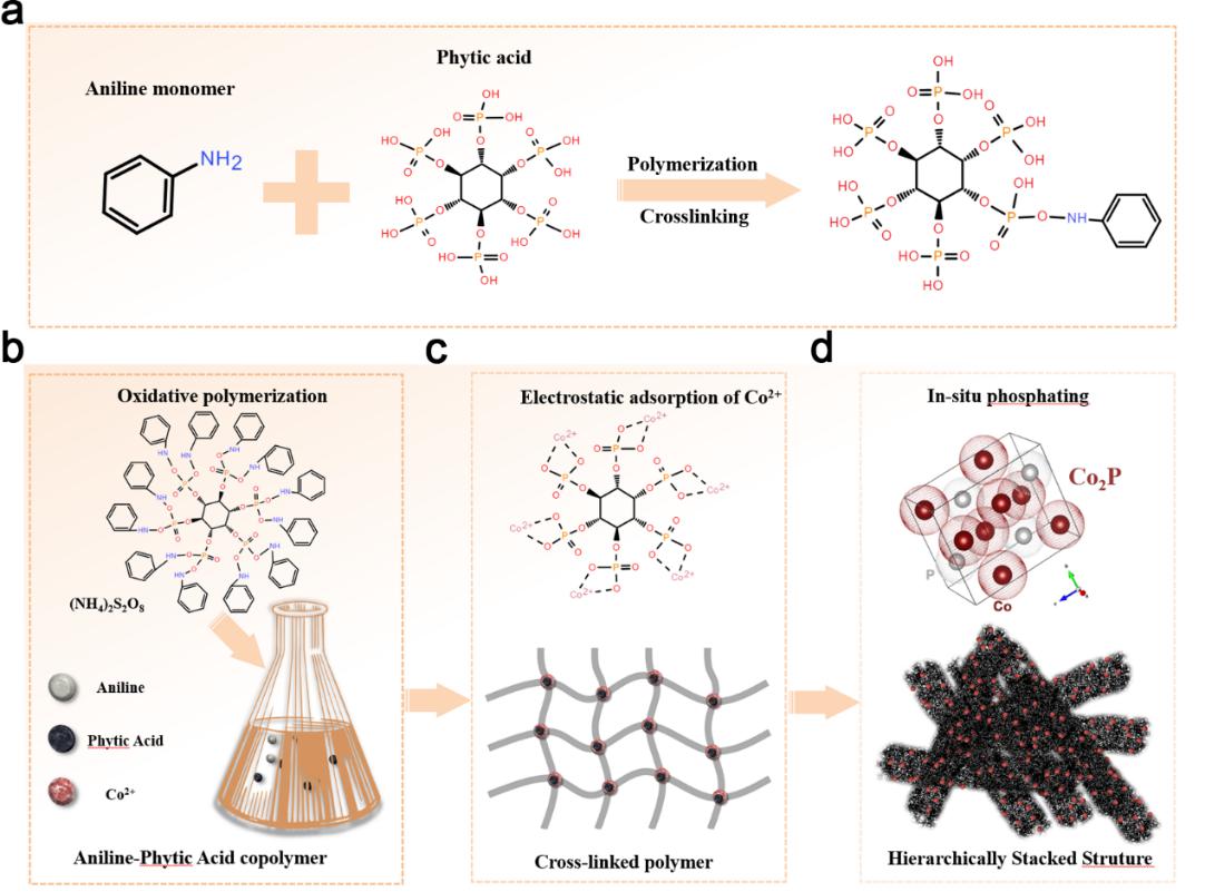 近日,我院杜岳副教授团队在金属空气电池氧电催化剂研究方面取得突破性进展。该团队在前期工作基础上 (Nano Res. 2023, 16, 8893-8901;Nano Res. 2023, 16, 8773-8781; J. Alloy. Compd. 2023, 960: 170789; Nano Res. 2024, 17, 5197-5205),以共轭聚苯胺-植酸聚合物 (pANI-PA) 为碳、氮、磷源,通过植酸分子与钴离子的配位作用锚定金属钴离子,直接煅烧制备了N, P共掺杂碳负载Co2P纳米颗粒催化剂 (Co2P@pDC-PA),用于氧还原反应 (ORR) 和析氧反应 (OER)。所制得的催化剂维持了共轭聚苯胺-植酸聚合物的三维结构,衍生碳材料将Co2P纳米颗粒封装,形成了碳包覆结构,在碱性介质中表现出优异的ORR/OER双功能活性和循环稳定性,以其作为二次锌-空气电池空气阴极活性组分展现出了190.0 mW cm-2的高功率密度和超长的充放电稳定性(超过1000 h)。本研究提供了一种共轭聚苯胺-植酸聚合物锚定过渡金属离子的原位磷化策略,该方法可推广至磷化铁、磷化镍、磷化钴等材料体系,为高效、经济、可规模化生产二次锌-空气电池电极材料提供了可行方法。