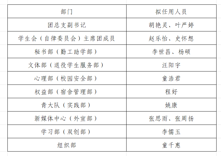 为了更好地充分发挥学生组织服务师生、自我管理的积极作用,努力建设一支素质优良、结构合理的团学干部队伍,本着公平、公开、公正的原则,经过个人申请、面试答辩、民意测评、组织考察等环节,学院团总支拟任用史怀想等14名学生为bv1946伟德国际第一届团学组织学生干部,考察期三个月(2024年7月至10月)。