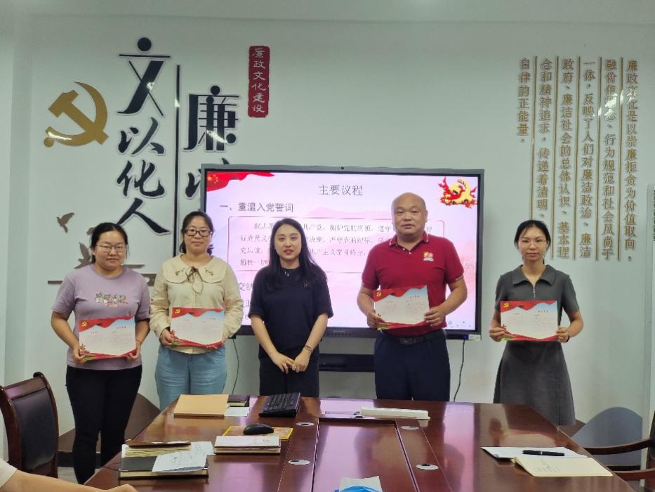 活动开始,全体党员集中交纳党费,重温入党誓词并集体诵读《中国共产党章程》第八章部分内容。随后,刘易斯同志为刘飞、周丽娜、闵家华、张萌等同志赠送政治生日贺卡,过政治生日。
