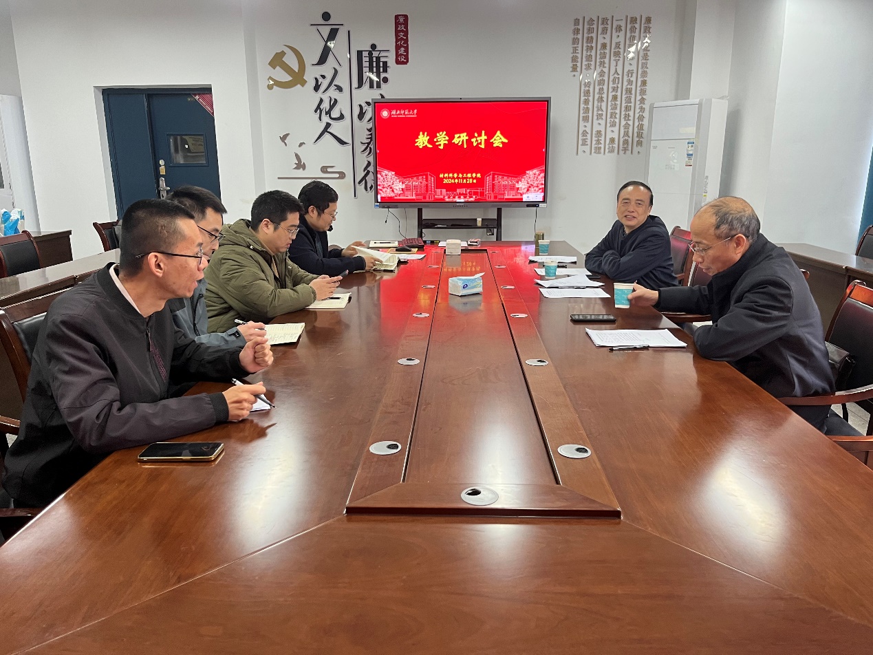 20241128日上午,学院在产教融合中心24424会议室组织召开了本学期期末考试专题教学研讨会。会议由学院副院长杨伦主持,学院教研室主任周建清、曹艺、王心宇,教学科研办公室副主任熊峰参加了会议。此外,会议还邀请了李江林教授和张少武教授进行指导。