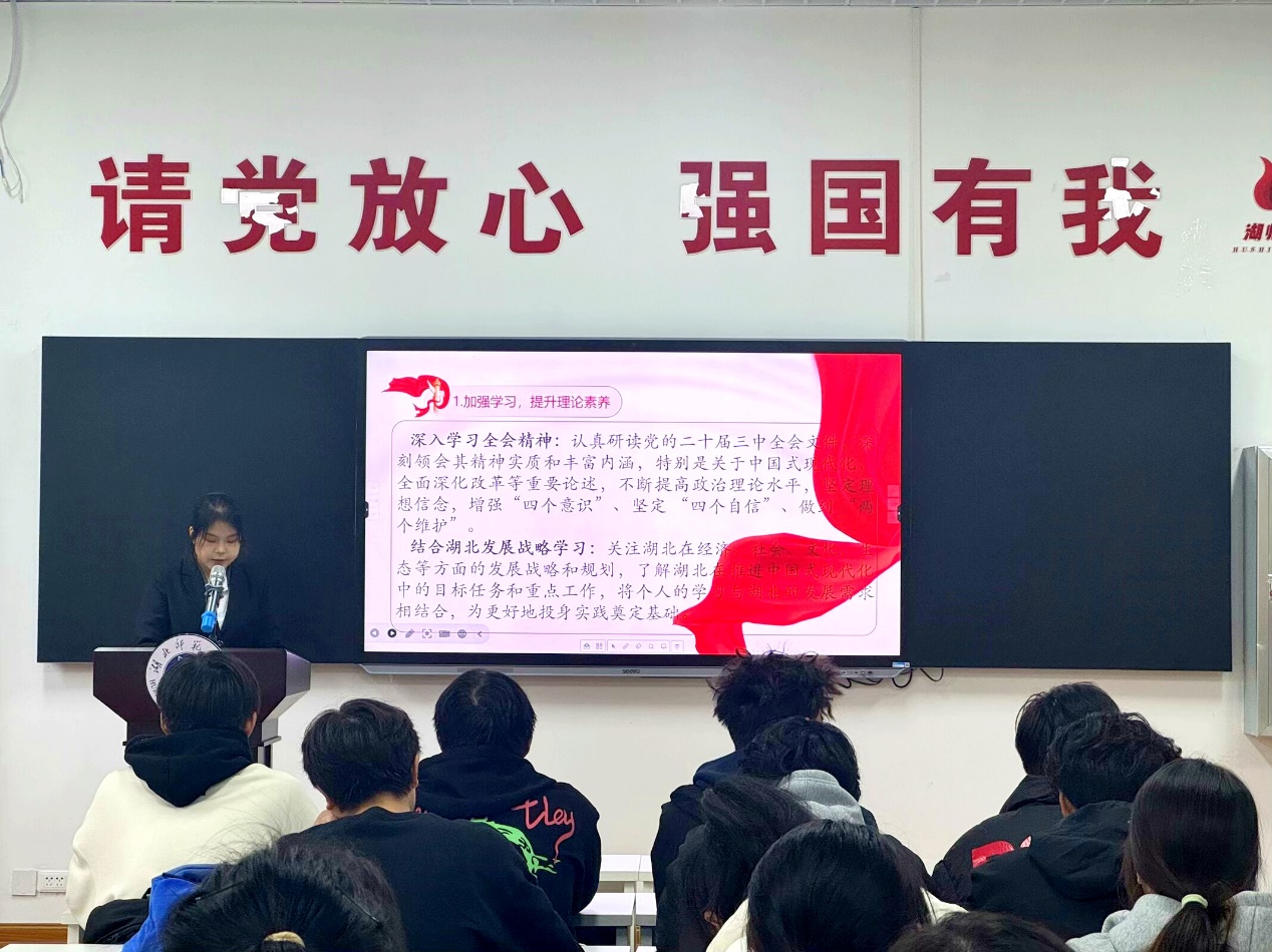 活动伊始,林爽以《学习党的二十届三中全会精神,争做时代接班人》为主题,给大家带来了一场精彩的讲座。她首先带领大家认识了党的二十届三中全会的主题和意义,然后阐述了进一步全面深化改革的目标原则。随后,她从湖北实践这一角度,详细讲述了如何贯彻落实全会精神,推动中国式现代化。最后,她希望材料学院学子们注重提升综合素质,将个人的发展与湖北的发展紧密联合起来,以实际行动践行党的二十届三中全会精神,为湖北的现代化建设贡献自己的智慧和力量。林同学的讲座生动切实,赢得了阵阵掌声。