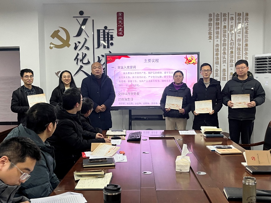 活动开始,全体党员集中交纳党费,重温入党誓词并集体诵读《中国共产党章程》第五章部分内容。随后,院党委书记刘飞为殷婷婷、刘易斯、孙富华、熊东彬、周建清同志赠送政治生日贺卡,过政治生日。
