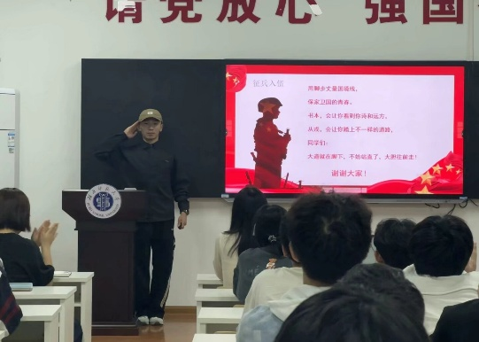 活动伊始,历史文化学院田娜娜同学向大家讲述了自己是如何产生了应征入伍的想法,以及当兵后自身的变化。随后,体育学院钟浩宇同学向大家分享了自身的入伍历程和在军中所经历的考验,以及当兵后的感受。最后,田娜娜为大家解读征兵政策,详细讲解了基层生活制度、士兵娱乐活动、征兵报名流程等内容。
