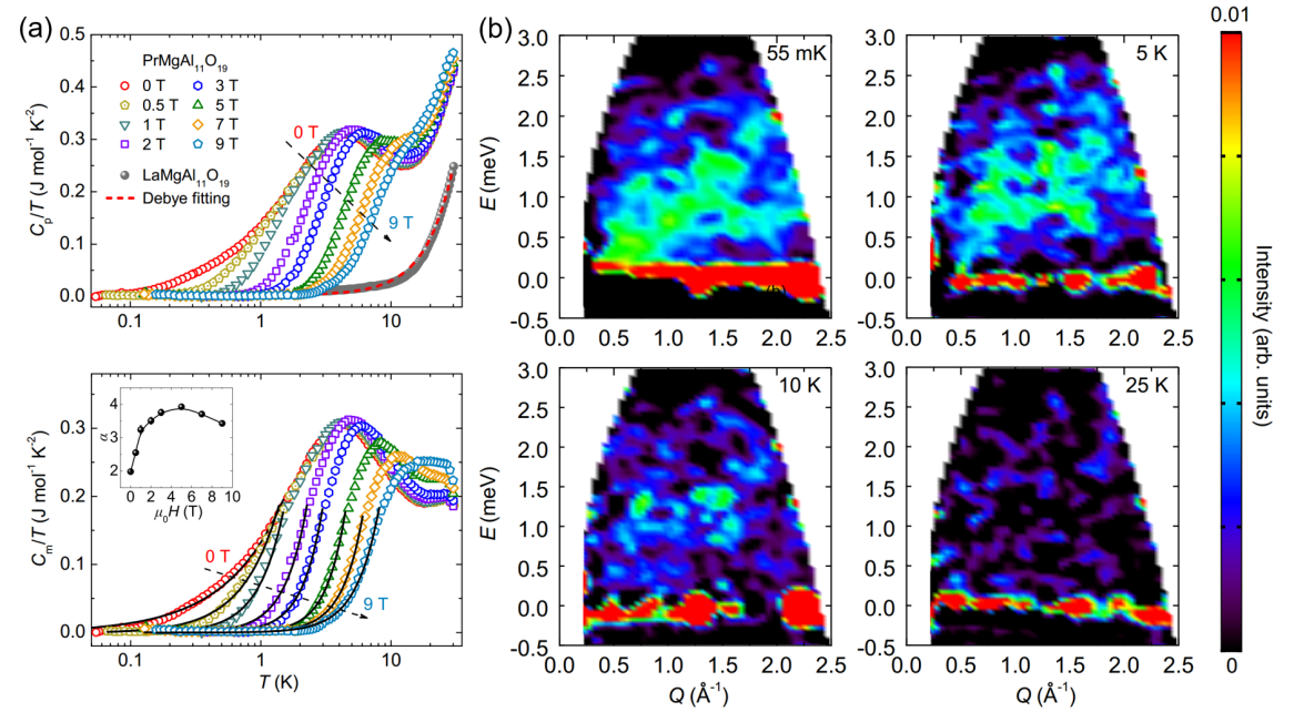 进展二:量子自旋液体代表了一种非平庸的量子磁性态,然而真实的材料体系却十分稀少,且大多集中在几何阻挫海森堡磁体中。为此,马祯团队制备了一种新的伊辛磁体PrMgAl11O19的高质量单晶。磁化率和比热表征均没有发现长程磁相变,零场下的极低温磁比热与温度的平方项具有依赖关系,说明磁无序基态可能是无能隙的狄拉克型量子自旋液体。非弹性中子散射测量验证了低温下磁无序的特征,且布里渊区中弥散的磁激发信号也和自旋液体态的特征相吻合。该工作证明了经典的伊辛系统也能展示量子自旋液体行为,为深入理解量子磁性物理提供了一个罕见的实验案例。研究成果以“Possible gapless quantum spin liquid behavior in the triangular-lattice Ising antiferromagnet PrMgAl11O19”,发表于物理学权威期刊Physical Review B [PRB 109, 165143 (2024)]。材料学院马祯博士为论文第一兼通讯作者,南京理工大学董召阳副教授和南京大学温锦生教授为共同通讯作者。