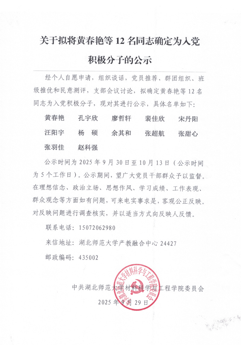 关于拟将黄春艳等12名同志确定为入党积极分子的公示