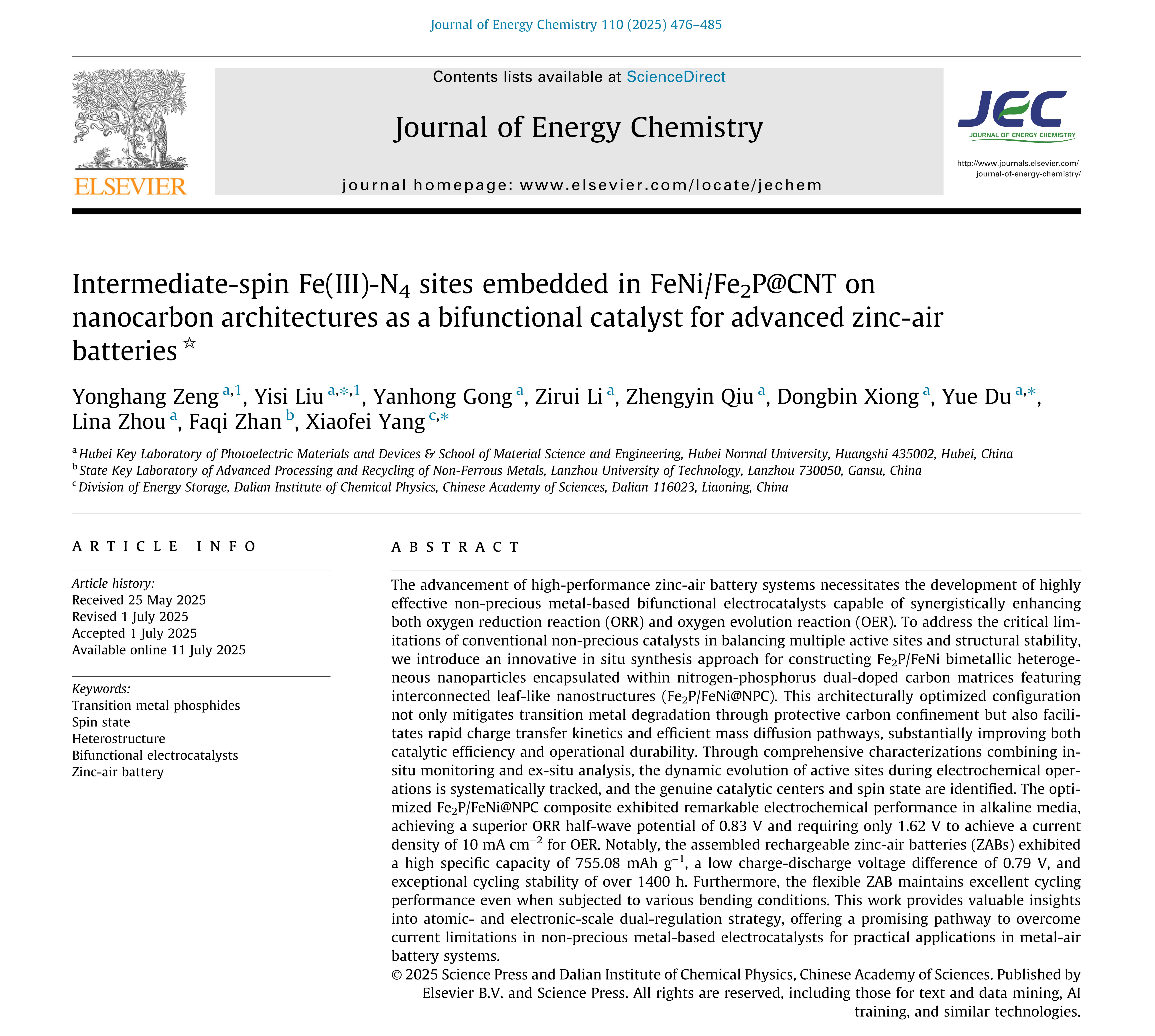 近日,我院刘易斯博士团队在金属空气电池氧电催化剂研究方面取得新的研究进展。相关研究成果以“Intermediate-Spin Fe(III)-N₄ Sites Embedded in FeNi/Fe₂P@CNT on Nanocarbon Architectures as a Bifunctional Catalyst for Advanced Zinc-Air Batteries”为题发表在国际知名期刊Journal of Energy Chemistry期刊上。Journal of Energy Chemistry(JEC)由中国科学院大连化学物理研究所与科学出版社主办,在能源化学、催化与电化学等交叉领域具有重要学术影响力,影响因子为14.9,中科院一区TOP。我院2023级硕士生曾永航为论文第一作者,刘易斯博士为该共同第一作者及通讯作者,伟德(国际)唯一官方为第一通讯单位,该研究得到光电转换材料与器件湖北省重点实验室平台支持。