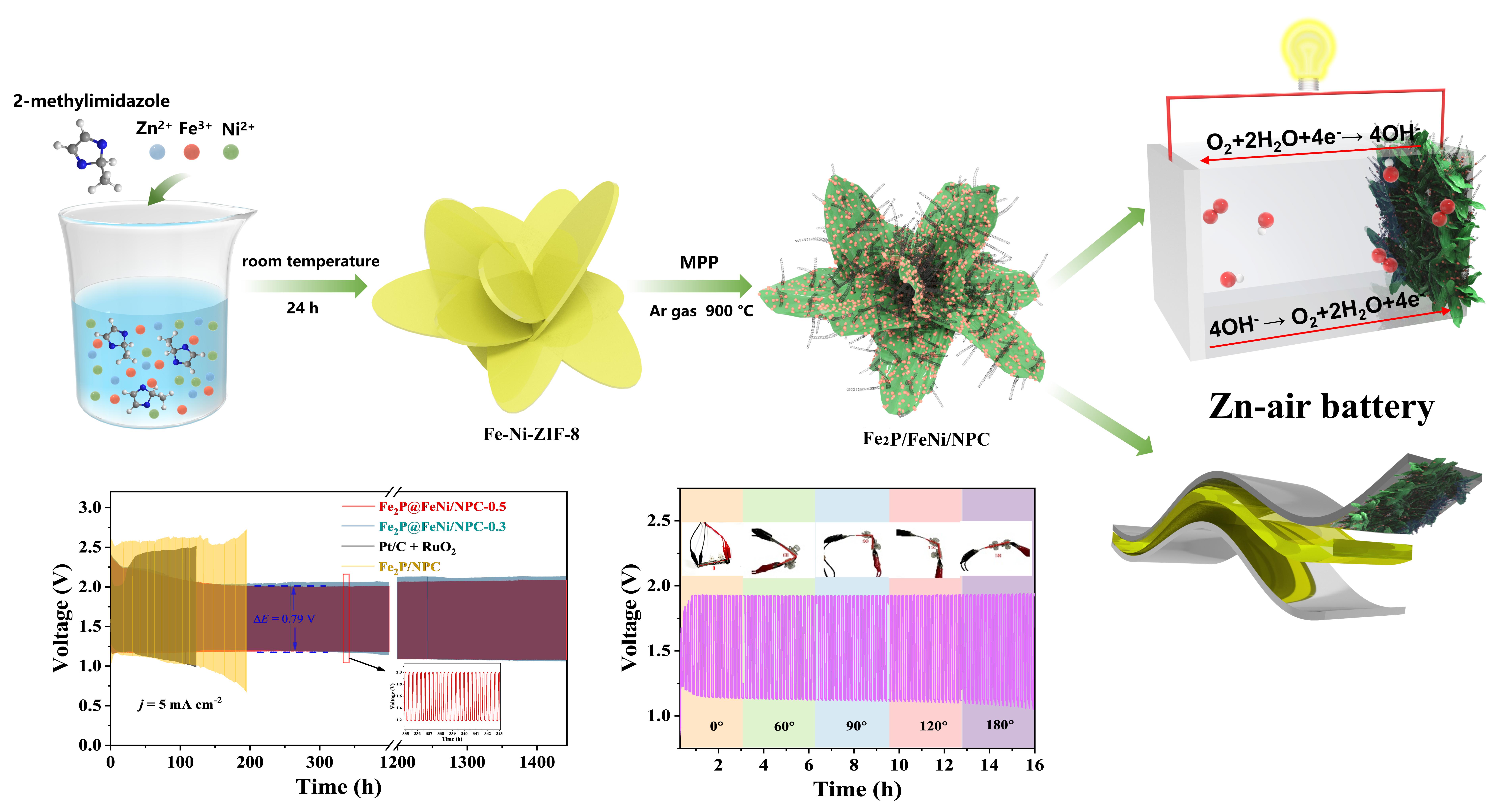 金属空气电池因其高比能量与环境友好性,被视为下一代储能技术的重要方向。但其核心难题在于正极侧需要同时具备高效ORR与OER的低成本双功能催化剂,并在长期充放电循环中保持稳定结构与活性。传统非贵金属催化剂常面临活性位点难以兼顾、结构易失稳等瓶颈。基于此,本研究合成了一种被碳基网络限域的 Fe2P/FeNi 异质纳米结构复合材料(Fe2P/FeNi/NPC),形成高密度中等自旋Fe(III)-N₄活性位点,FeNi/Fe₂P 异质纳米结构和碳纳米管导电网络耦合,使材料兼顾了高活性、快速传输与高稳定性三要素。组装的可充电锌空气电池(ZAB)表现出755.08 mAh g-1的高比容量、0.79 V 的低充放电电压差以及超过 1400 h 的卓越循环稳定性。结合原位拉曼光谱和第一性原理计算,研究揭示了中间自旋态 Fe(III)-N₄ 位点的电子结构调控机制,该自旋态可优化 Fe-3d电子的离域性与自旋极化效应,从而平衡 *OH、*O、*OOH 等反应中间体的吸附与解吸过程,显著提升双功能氧电催化活性。该成果系统阐明了自旋态调控与异质结构协同对非贵金属催化剂性能增强的作用机制,为设计高效稳定的 Fe-N-C 系催化剂提供了新的思路。