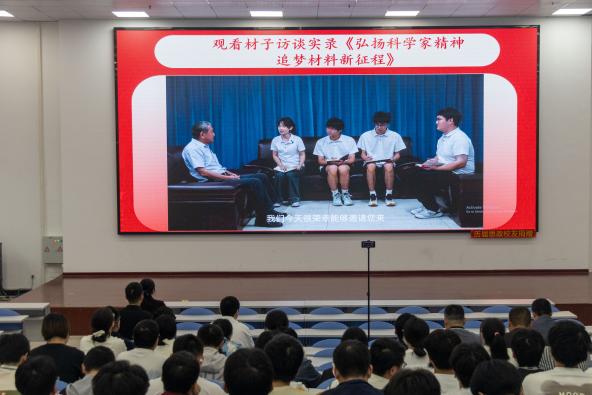 紧接着,“看短片”环节,通过观看视频快板《一代宗师吴有训》和《弘扬科学家精神 追梦材料新征程》材子访谈实录,师生们深入了解了吴有训、刘俊明等科学家的卓越成就与高尚品格,深受启发。