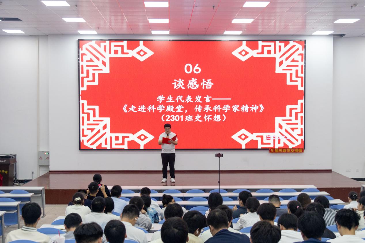 学生代表2301班史怀想在“谈感悟”环节中,以《走进科学殿堂,传承科学家精神》为题,分享了自己对科学家精神的理解与感悟,表达了将科学家精神融入日常学习与科研的决心。