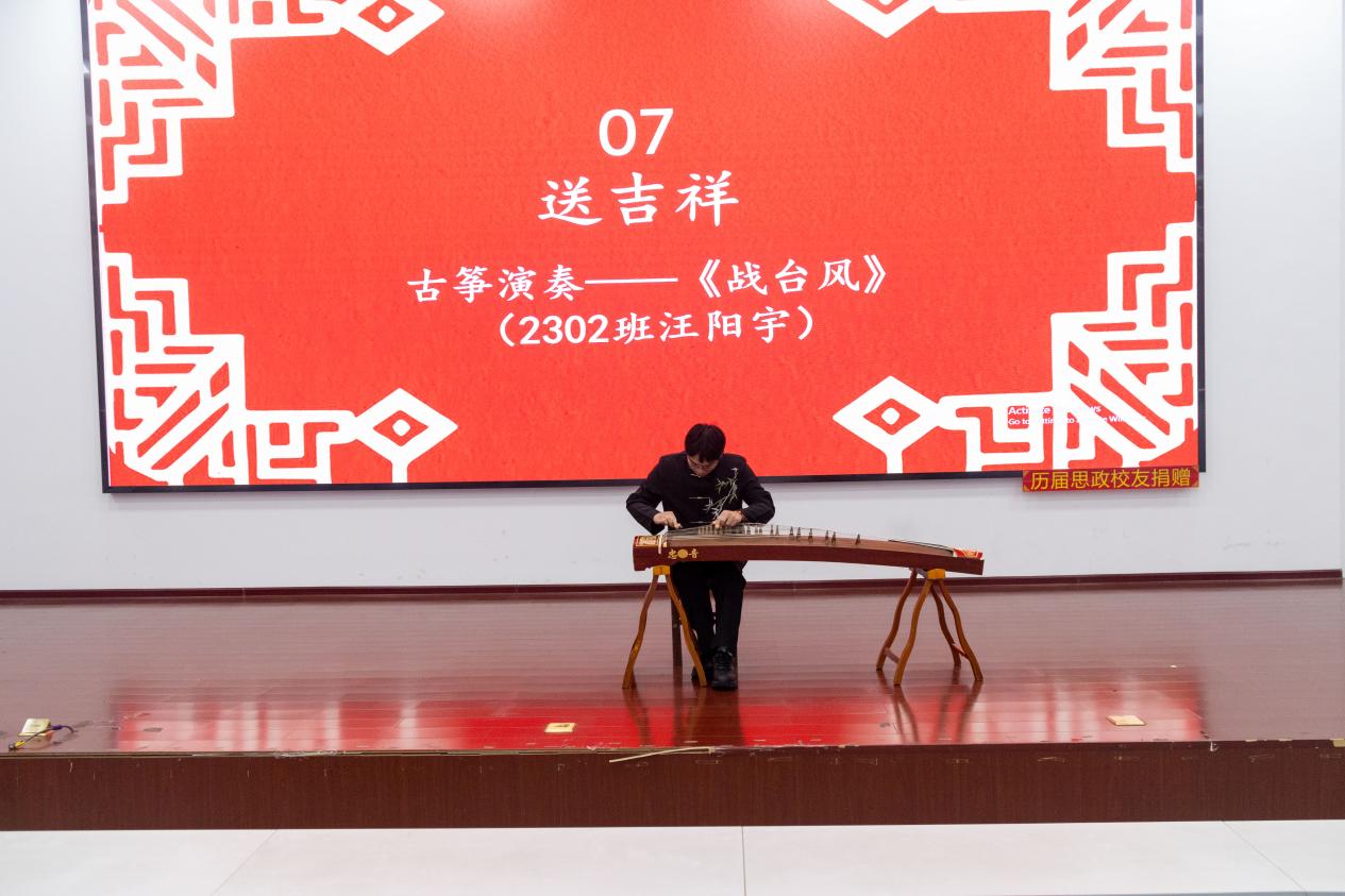 音乐是心灵的共鸣,活动的高潮部分之一是“送吉祥”环节。2302班汪阳宇同学以一曲古筝独奏《战台风》,为全体师生送上真挚的祝福与美好的期望,其精湛的技艺和激昂的旋律,仿佛在现场描绘出了劳动人民与风暴搏斗的坚韧画面,恰如科学家们在科研道路上迎难而上的身影,鼓舞着大家在今后的科研、学习与生活中继续发扬科学家精神。
