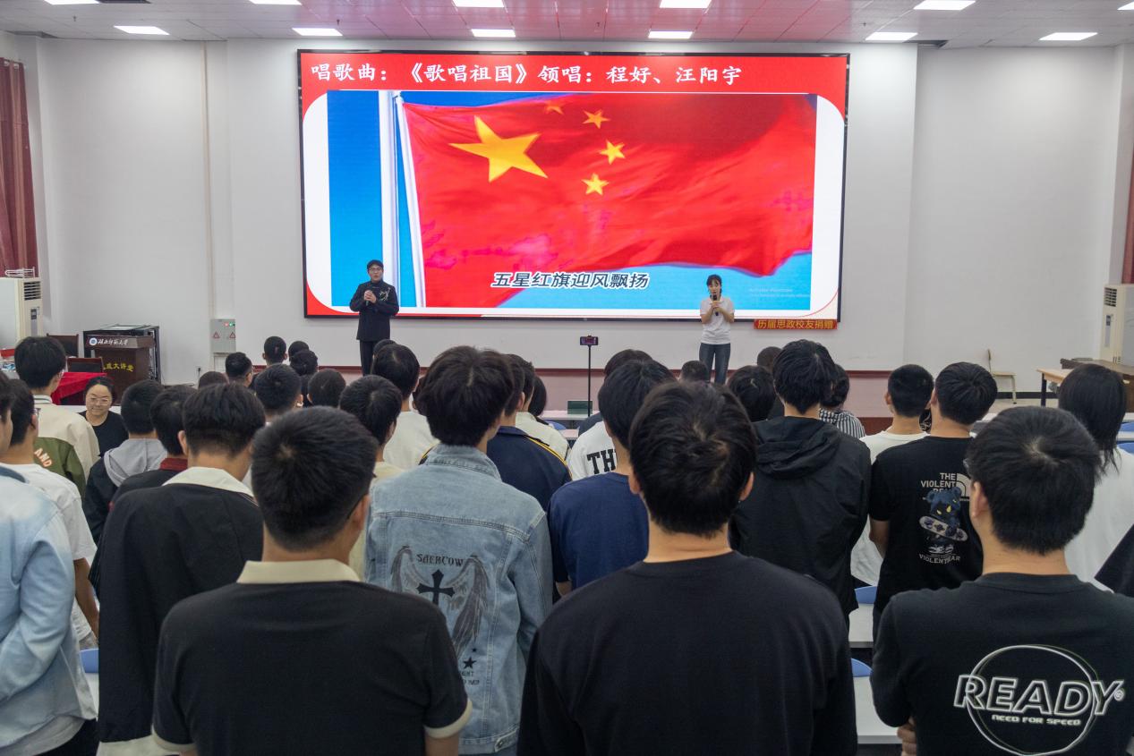 随后,“唱歌曲”环节中,全体师生起立合唱《歌唱祖国》,激昂的歌声表达了大家对祖国的热爱与祝福。