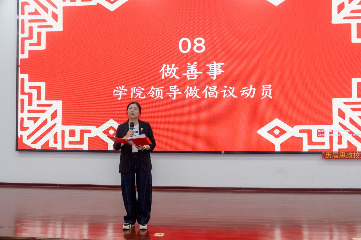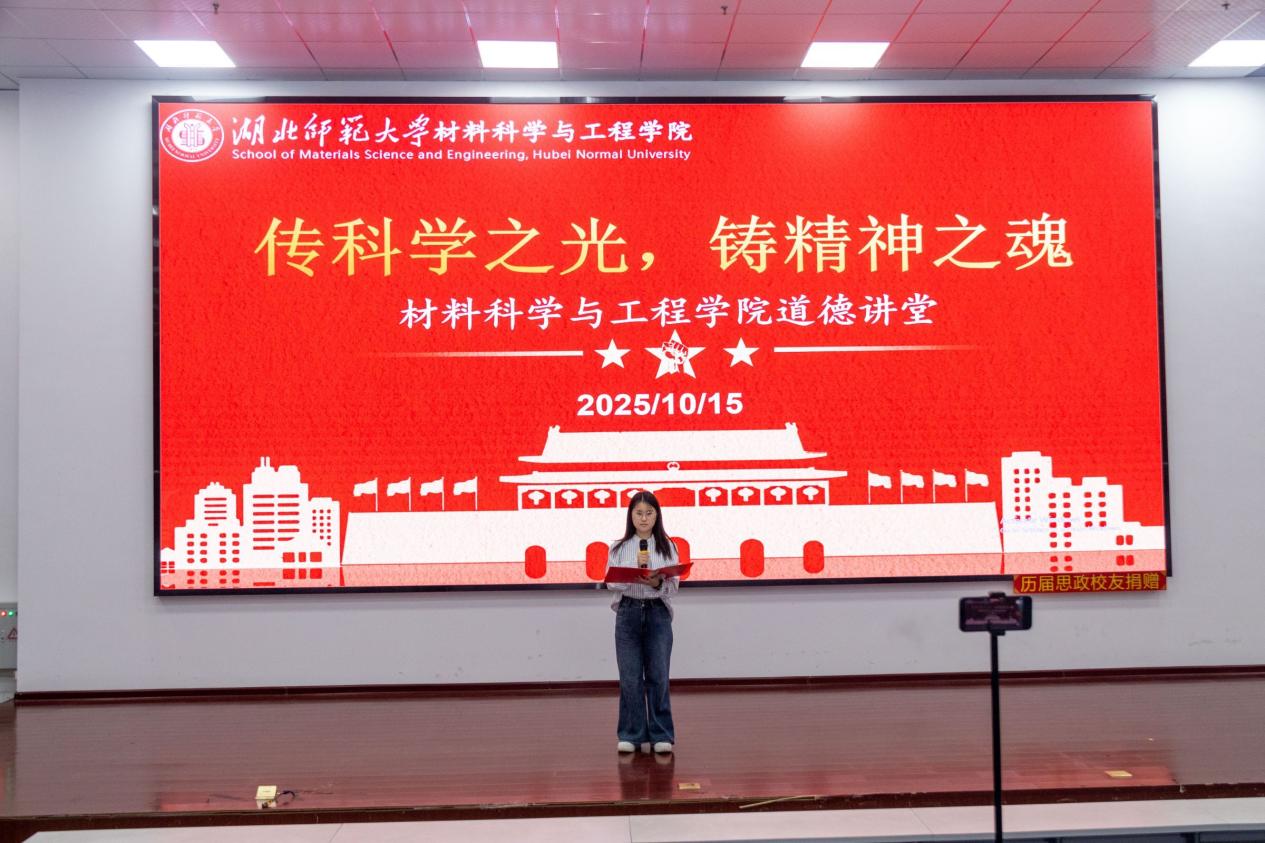 活动最后,材料学院党委副书记殷婷婷对本次活动进行了点评总结,并提出了行动倡议。她强调,道德讲堂从不是 “听完就忘”的仪式,而是“学以致用”的起点,传承科学家精神更不是一句“空口号”,而是需要全体师生在日常学习生活工作中付诸实践。同时,她也倡导全院师生每一个人都要发挥作用,老师要当好学生学习科研的“引路人”,高年级学生要“传帮带”,指导新生选导师、进实验室。大家携手共进,为国家材料事业的发展贡献更多“湖师力量”!