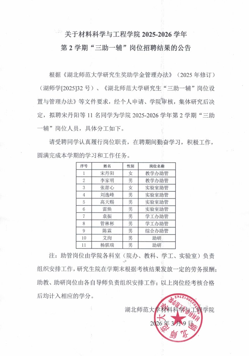 关于bv1946伟德国际2025-2026学年第2学期“三助一辅”岗位招聘结果的公告