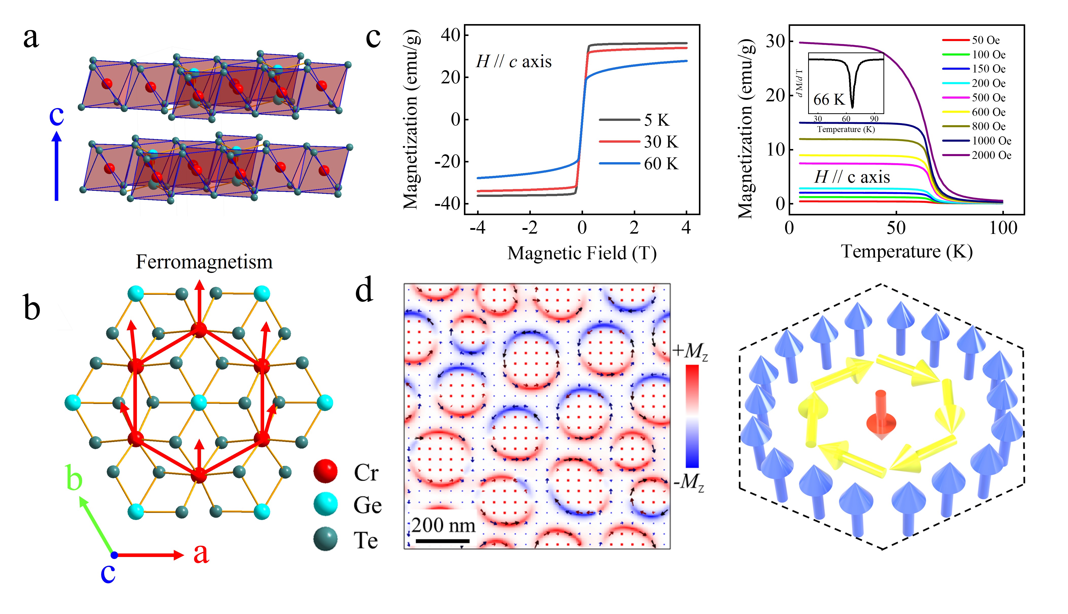 成果二:范德华(vdW)材料由于其独特的晶体结构为探索涌现物理现象及实现下一代电子与自旋电子应用提供了多功能平台。然而,范德华晶体与磁性等本征特性之间的直接关联尚未得到充分研究。针对上述问题,谢彩红与孙富华博士团队在范德华晶体Cr2Ge2Te6中实现了多种与晶体结构相关的拓扑自旋纹理的可控诱导。磁力显微镜成像结果表明,这些磁结构呈现出丰富的形貌多样性,不仅包括传统的圆形结构,还包括从三角形到八边形等高度规则的多边形结构,并以周期性图案排列。该研究首次明确揭示了拓扑结构准粒子特性的完整演化过程,包括产生、结构畸变和碰撞。进一步模拟分析表明,这些结构的形成源于单轴磁晶各向异性与偶极相互作用之间的协同作用,并受到晶格的进一步调控。该研究揭示了范德华磁体中先前未被认识的结构-性能关系,为设计与调控新型拓扑自旋纹理开辟了新途径。该研究成果以“Lattice-Driven Topological Spin Textures in Cr2Ge2Te6 Single Crystals”为题,发表在Advanced Functional Materials(中科院一区,TOP期刊,Nature Index期刊,IF=19)上。谢彩红博士为论文共同第一作者,中国科学院强磁场科学中心冯启元副教授、中国科学技术大学陆轻铀教授为论文共同通讯作者。bv1946伟德国际为署名单位。