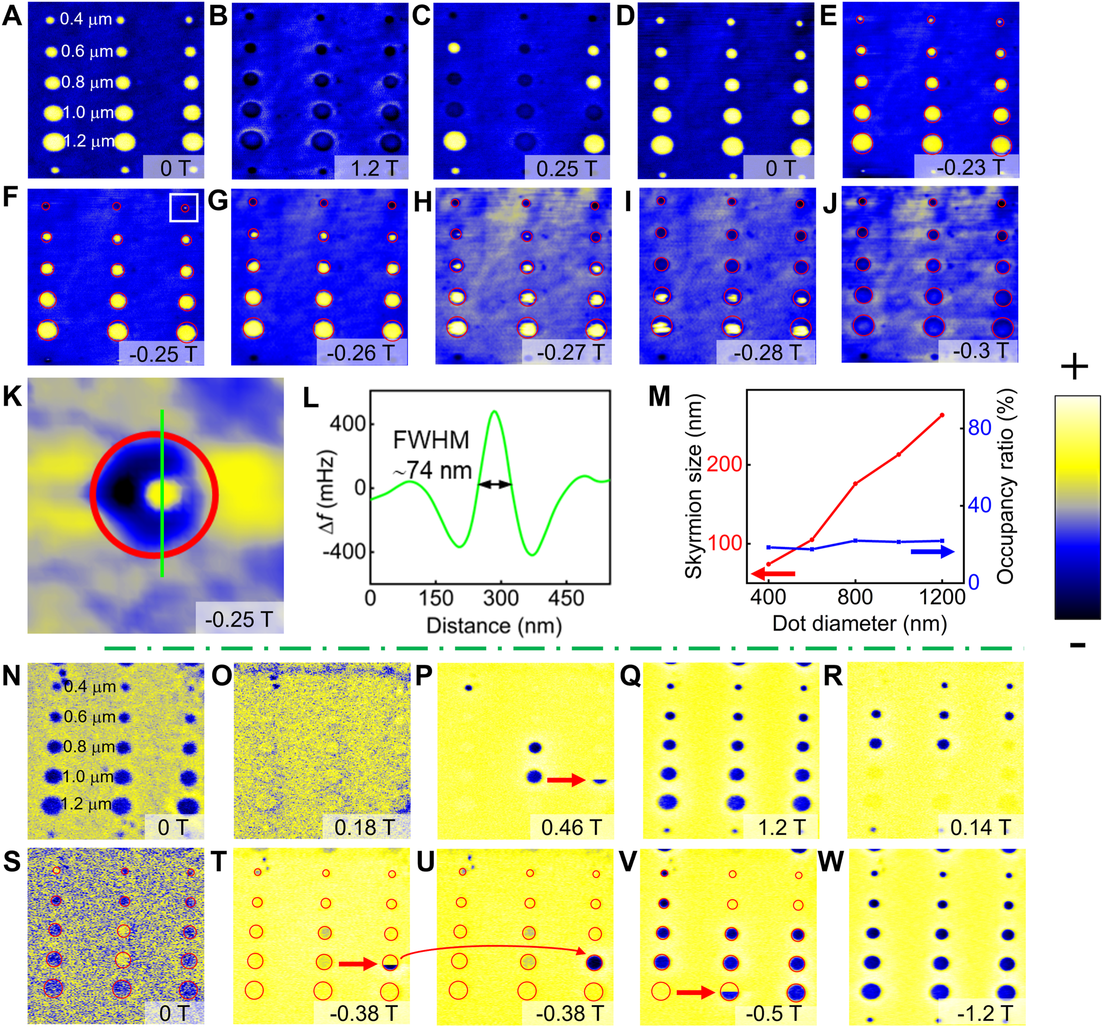 成果一:实现对单个斯格明子的可寻址、高精度调控,特别是在室温条件下的稳定操控,是该领域面临的最核心问题。本研究基于Co/Pt多层人工反铁磁耦合纳米盘阵列结构,通过自研高灵敏磁力显微镜系统,在室温条件下引入周期性局域振荡磁场,实现了对单个斯格明子尺寸的连续、可分辨调控。实验结果表明,在保持外加静态磁场不变的情况下,仅通过局域周期性磁场扫描操作,即可实现斯格明子尺寸从数百纳米连续缩小至数十纳米,尺寸缩小接近一个数量级。同时,斯格明子的写入、删除以及局部形貌精细调控均可实现,展示出优异的可控性和可重复性。该研究为为拓扑自旋结构的工程化应用和低功耗自旋电子学发展提供了新的实验基础。该研究成果以“Giant Tunability of Individual Magnetic Skyrmion Size Via an Oscillating Local Magnetic Field”为题,发表在Rare Metals(中科院一区,TOP期刊,IF=11)上,并且,该工作被选为期刊封面。谢彩红博士为论文第一作者,南京师范大学马付胜教授、中国科学院强磁场科学中心冯启元副教授、中国科学技术大学陆轻铀教授为论文共同通讯作者。伟德(国际)唯一官方光电转换材料与器件湖北省重点实验室、bv1946伟德国际为第一通讯单位。